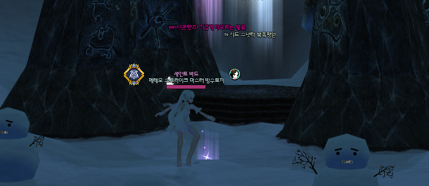 마지막으로 구조물 앞 이펙트를 조사하면 차갑게 타오르는 불꽃 퀘스트가 완료됩니다.