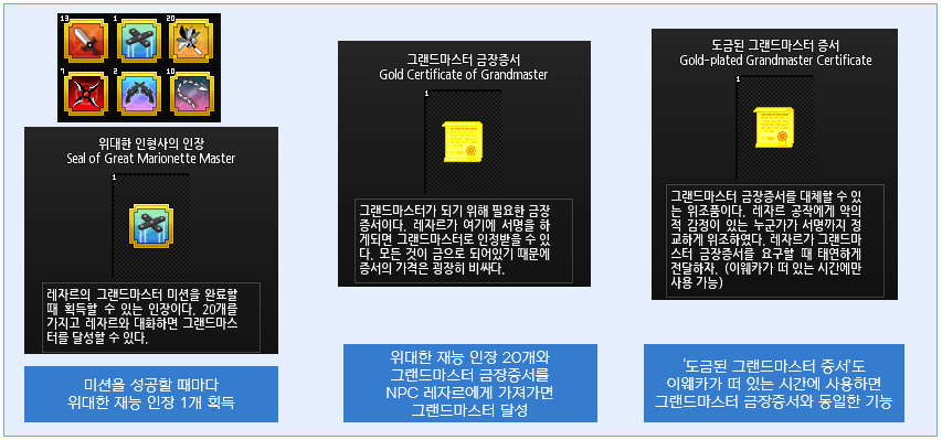 그랜드마스터 금장증서와 위대한 재능 인장을 [20개] 모아서 레자르에게 가져가면 그랜드마스터로 인정받게 됩니다.