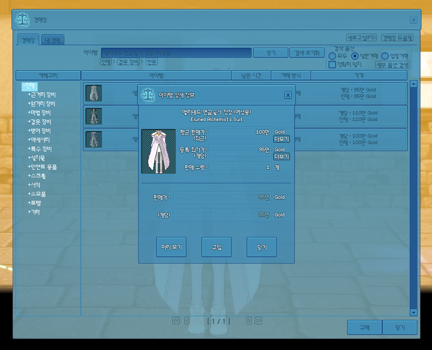 엘리네드가 만든 연금술사 정장. 연금술사 정장의 실용성을 살리면서 더욱 멋스럽게 디자인되었다. 한 번 손에 아무 것도 들지 말고 이 옷을 입어보자.