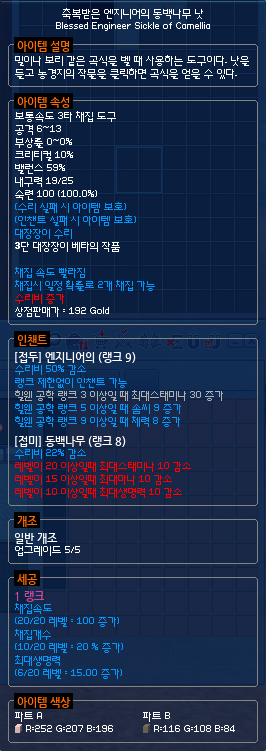 내가 가지고 있는 채속낫, 내구도가 살짝 아쉽기는 한데, 그래도 매우 쓸만하다. 수리비 감소 옵션이 있는 엔지니어의/동백나무 인챈트를 발랐고, 채집속도와 채집개수 듀얼옵션이다. 개조식이 살짝 아쉽기는 한데, 양털을 깎을 때도 꽤 유용하므로 2개 채집 가능 개조식도 나쁘지 않은 것 같다.